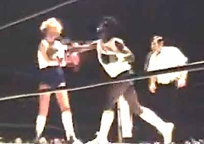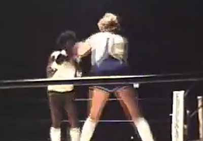 Weighing in at 133 pounds and wearing a sleeveless t-shirt tucked into a blue wrestling singlet, Allbery was fashionably late making her appearance to step between the ropes, causing the ring announcer to joke, “Isn’t that just like a woman?” Dressed in simple green running shorts and a white tank top, Foster was announced at 131 pounds. Both women sported knee-length tube socks fashionable at the time. Being made to wait through the prolonged pre-fight formalities notwithstanding, Foster wasted little time getting down to business, pumping her left jab in Allbery’s face and enjoying repeated success with right hand follow-ups, confirming that she indeed knew what she was doing.