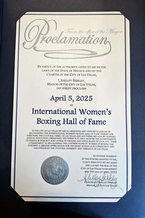 LAS VEGAS, NV [February 27, 2025] In an exciting announcement for boxing enthusiasts and advocates of women’s boxing, Mayor Shelley Berkley of the City of Las Vegas has proclaimed April 5, 2025, as “International Women’s Boxing Hall of Fame Day.” This proclamation marks a significant milestone for the International Women’s Boxing Hall of Fame (IWBHF), which will host its annual induction ceremony at the Orleans Hotel & Casino in Las Vegas. This year’s event promises not just celebration but also recognition of the extraordinary contributions women have made to the sport of boxing, and those outside the ring, male and female who have contributed tremendously to the sport of women’s boxing.